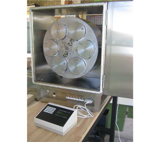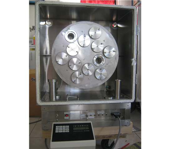 This is a special version of the 6 bomb oven above. For those laboratories that need more bombs and smaller. The rotor has 12 or 16 sample containers of 45 to 50 mL sample volume mounted on a thick aluminium disc. The disc is rotated at 20rpm or variable speed accoring to customer requirements. Each bomb is heated by 2 x 300W cartridge heaters. The temperature of a representitive "bomb" is monitored as well as the heating jacket. As a check, a diagonally opposite heating jacket is monitored. Due to the mounting of all heating jackets on a thick aluminium rotor, all bombs are heated evenly. Faulty heaters are detected by detecting current of 3 or 4 banks of heaters.